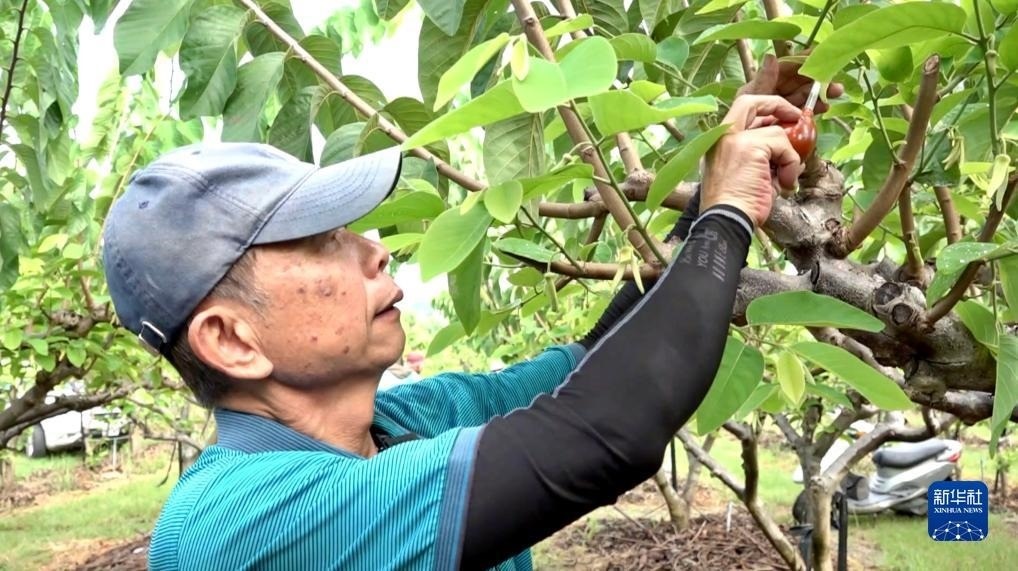 果農(nóng)蔡鴻義在為番荔枝授粉(8月9日攝)。新華社記者 王承昊 攝