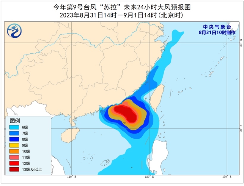 央視網(wǎng)消息:中央氣象臺(tái)8月31日10時(shí)繼續(xù)發(fā)布臺(tái)風(fēng)紅色預(yù)警,今年第9號(hào)臺(tái)風(fēng)“蘇拉”(超強(qiáng)臺(tái)風(fēng)級(jí))的中心今天(31日)上午10點(diǎn)鐘位于廣東汕尾東南方向大約335公里的南海東北部海面上,就是北緯21.0度、東經(jīng)118.0度,中心附近最大風(fēng)力有17級(jí)(58米/秒),中心最低氣壓為925百帕,七級(jí)風(fēng)圈半徑250-280公里,十級(jí)風(fēng)圈半徑130公里,十二級(jí)風(fēng)圈半徑70公里。