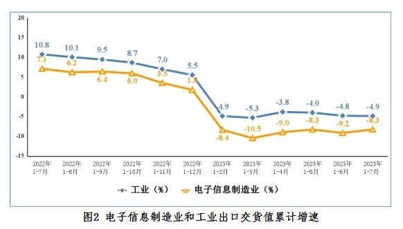 1—7月份,規(guī)模以上電子信息制造業(yè)出口交貨值同比下降8.3%,降幅較上半年收窄0.9個(gè)百分點(diǎn),比同期工業(yè)降幅深3.4個(gè)百分點(diǎn)。7月份,規(guī)模以上電子信息制造業(yè)出口交貨值同比下降5.1%。