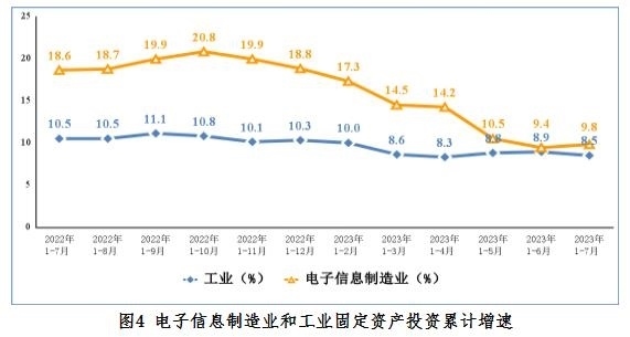 1—7月份,電子信息制造業(yè)固定資產(chǎn)投資同比增長(zhǎng)9.8%,比同期工業(yè)投資增速高1.3個(gè)百分點(diǎn),但比高技術(shù)制造業(yè)投資增速低1.7個(gè)百分點(diǎn)。