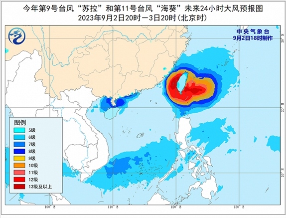 大風(fēng)預(yù)報:9月2日20時至3日20時,受“蘇拉”影響,廣東中西部沿海、廣西南部沿海、海南島北部沿海、珠江口及澳門等地將有6-7級大風(fēng),南海西北部、北部灣東部和瓊州海峽將有8級、陣風(fēng)9-10級的大風(fēng);受“??庇绊?,巴士海峽南部、臺灣海峽西部、東海南部及釣魚島附近海域、浙江南部沿海、福建中北部沿海、臺灣島沿海將有6-8級、陣風(fēng)9-10級大風(fēng),巴士海峽北部、臺灣海峽東部、臺灣以東洋面及臺灣島南部沿海的風(fēng)力有9-12級,陣風(fēng)13-14級,“??敝行慕?jīng)過的附近海面或地區(qū)的風(fēng)力有13-16級,陣風(fēng)17級。