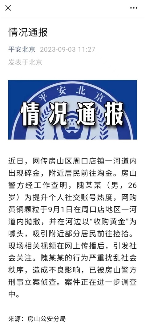 ·北京警方通報(bào)房山一河道出現(xiàn)碎金疑似物:實(shí)為一男子網(wǎng)購黃銅顆粒拋撒。