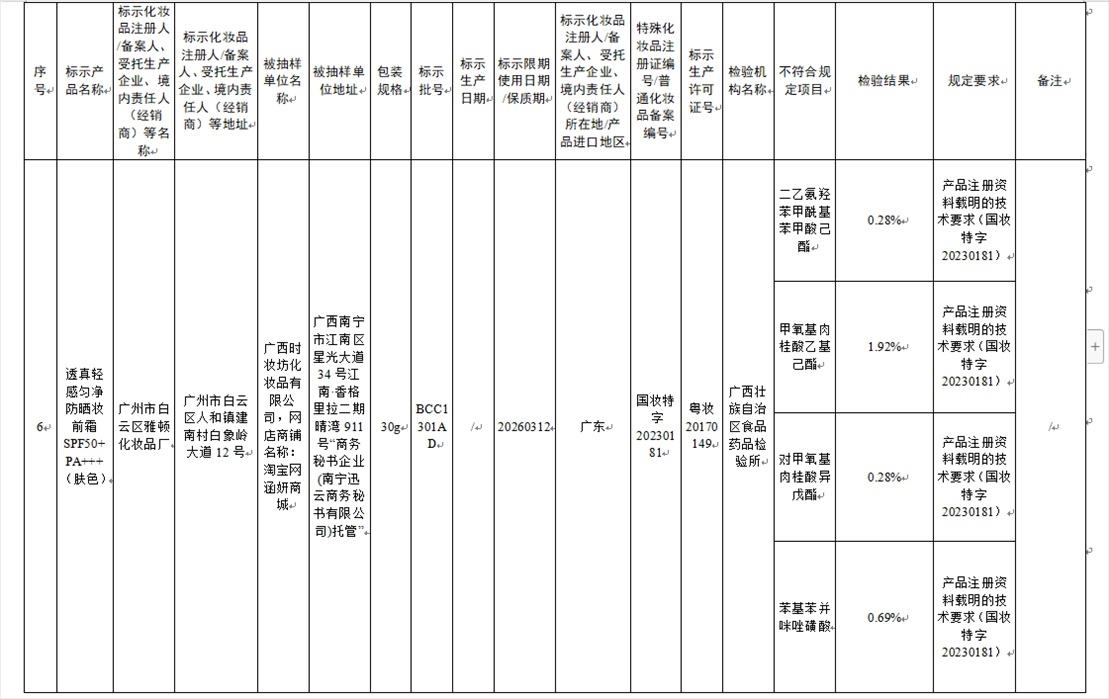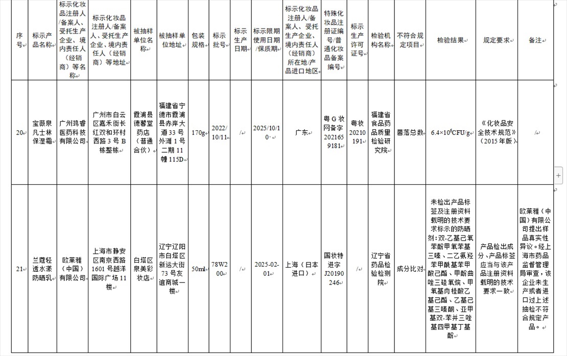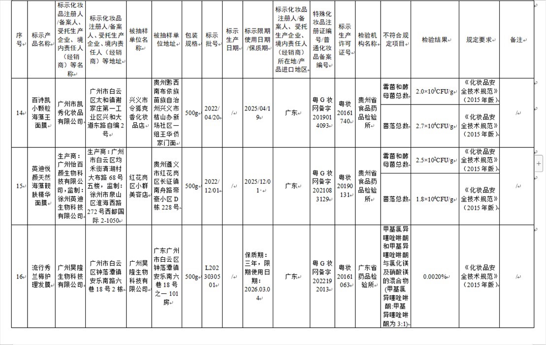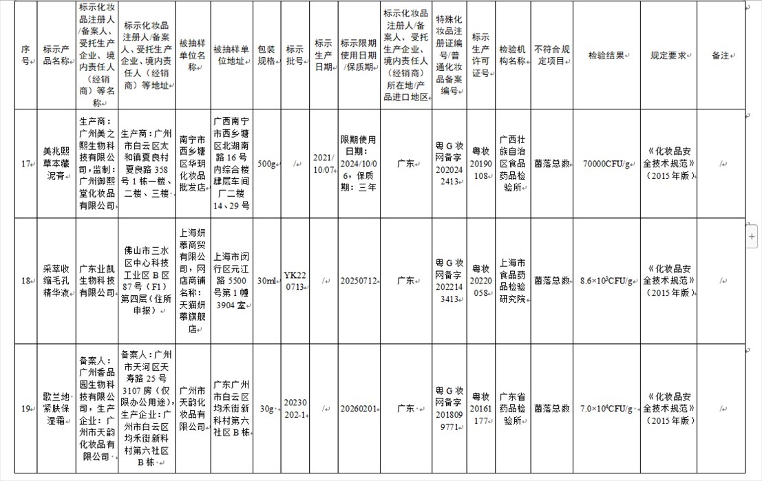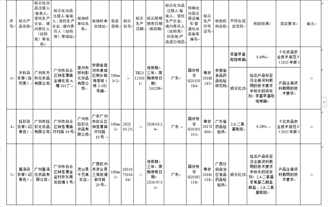 國家藥監(jiān)局網(wǎng)站今天發(fā)布通告稱,在2023年國家化妝品抽樣檢驗(yàn)工作中,經(jīng)重慶市食品藥品檢驗(yàn)檢測(cè)研究院等單位檢驗(yàn),產(chǎn)品標(biāo)簽標(biāo)示為廣州市天科化妝品有限公司生產(chǎn)的天科染發(fā)膏(自然黑)等23批次化妝品不符合規(guī)定(見下圖表格)。