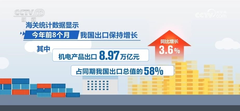 海關(guān)統(tǒng)計(jì)數(shù)據(jù)顯示,2023年前8個(gè)月,我國出口保持增長,其中,機(jī)電產(chǎn)品出口8.97萬億元,同比增長3.6%,占同期我國出口總值的58%;汽車及零配件、船舶、電工器材出口分別增長50.1%、28%、18.6%。
