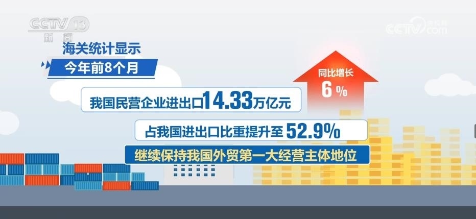 海關(guān)統(tǒng)計(jì)顯示,2023年前8個(gè)月,我國(guó)民營(yíng)企業(yè)進(jìn)出口14.33萬(wàn)億元,同比增長(zhǎng)6%,占我國(guó)進(jìn)出口比重提升至52.9%,繼續(xù)保持我國(guó)外貿(mào)第一大經(jīng)營(yíng)主體地位。