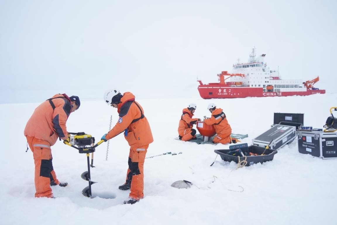 中國(guó)第13次北冰洋科學(xué)考察隊(duì)在北極點(diǎn)附近開展海冰綜合作業(yè)