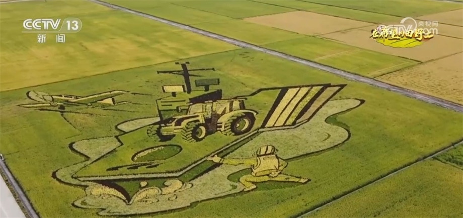 總臺央視記者 蔣樹林:金秋9月的稻田是什么顏色的?9月的稻香又是什么味道?來這里,有可能會找到您想要的答案。我現(xiàn)在是在黑龍江北大荒閆家崗農(nóng)場。大家來看,這個稻田觀景臺有十多米高,因此站在這里,秋日稻田大片的圖案映入眼簾,今年稻田畫以“鄉(xiāng)村振興”“數(shù)字農(nóng)業(yè)”為主題,生動展現(xiàn)了“讓農(nóng)業(yè)更美好、讓農(nóng)民更幸?!钡拿篮迷妇?。稻田畫是農(nóng)民們勤勞與智慧的展現(xiàn),他們用稻田畫為家鄉(xiāng)水稻代言,而對于在黑土地打拼的北大荒人而言,還有更重要的意義。