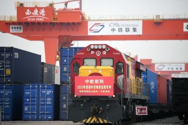 1月13日,滿載著來自哈薩克斯坦1300噸面粉的中歐班列抵達西安國際港站。這標(biāo)志著2023年首趟中歐班列年貨物資返程專列順利抵達西安,為即將到來的春節(jié)拉來了“洋年貨”。