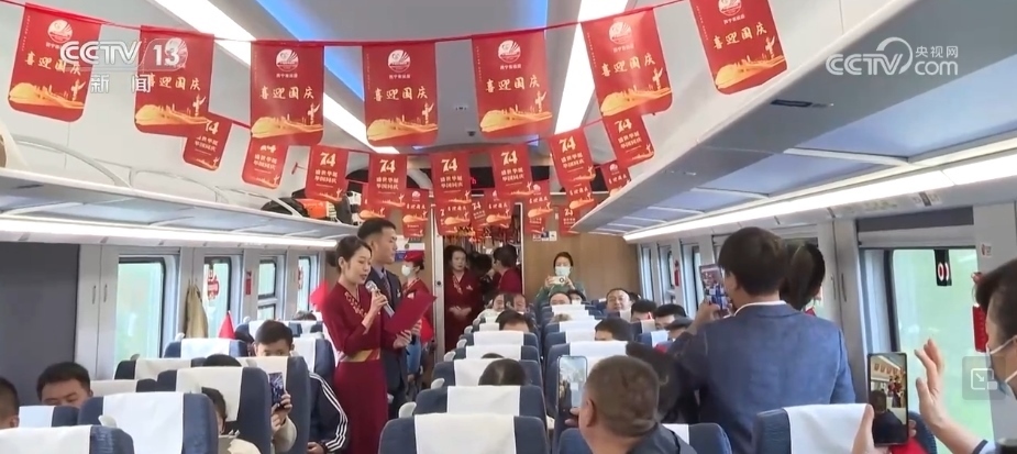 車(chē)廂內(nèi)掛滿(mǎn)了國(guó)慶主題的旗幟、窗花,“天路格?;ā蔽乃囆》株?duì)揮動(dòng)著手中的五星紅旗,與旅客齊聲合唱《我和我的祖國(guó)》,還表演了詩(shī)朗誦、快板等節(jié)目,贏得了現(xiàn)場(chǎng)旅客的掌聲。