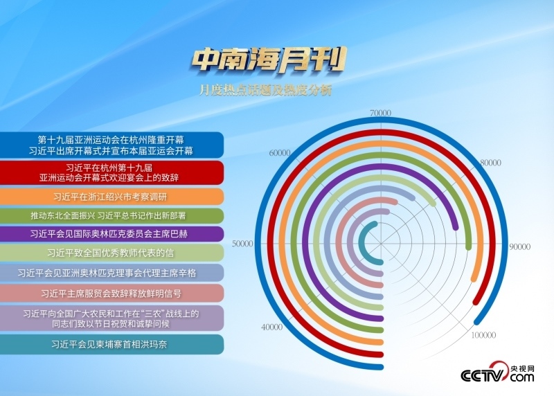 9月23日,在寓意豐收和團(tuán)圓的秋分時(shí)節(jié),亞運(yùn)之光映照神州大地,亞運(yùn)之火點(diǎn)燃國人激情,綻放出健康中國的生動(dòng)場景。中國以真摯的熱情歡迎亞洲體育健兒和國際貴賓,定格下四海賓朋如約而至的“杭州時(shí)刻”。央視網(wǎng)“智聞”系統(tǒng)提取分析的9月全網(wǎng)時(shí)政新聞熱點(diǎn)中,習(xí)近平主席在杭州亞運(yùn)會(huì)期間的外交活動(dòng)備受輿論關(guān)注。