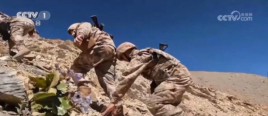 一路走走停停艱難前行。巡邏車行駛至距離點(diǎn)位6公里處停了下來,由于道路塌陷,官兵們只好下車改為徒步巡邏。行走在坡度近70度的陡峭山路上,路面全是碎石,加上海拔不斷攀升,這對(duì)巡邏官兵的體能是極大的挑戰(zhàn)。經(jīng)過近4個(gè)小時(shí)的艱難攀爬,巡邏分隊(duì)終于到達(dá)了點(diǎn)位。