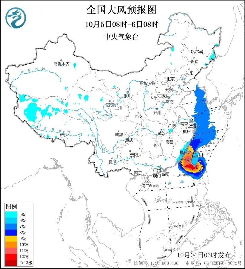 10月5日08時至6日08時,東海西南部海域、臺灣海峽、臺灣以東洋面、巴士海峽、南海東北部偏北海域?qū)⒂?~9級、陣風(fēng)10~11級的大風(fēng),其中臺灣海峽、臺灣以東洋面、巴士海峽的部分海域風(fēng)力可達10~12級、陣風(fēng)13~14級,臺風(fēng)“小犬”中心經(jīng)過的附近海域風(fēng)力可達13~14級、陣風(fēng)15~16級,黃海東部海域、東海西北部海域?qū)⒂?級、陣風(fēng)8級的大風(fēng);西藏西部將有5~6級、陣風(fēng)7級的大風(fēng),浙江沿海、福建沿海、臺灣島將有6~8級、陣風(fēng)9級的大風(fēng)。