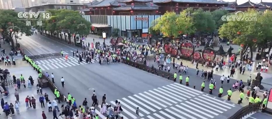 通過對(duì)系統(tǒng)獲取的大數(shù)據(jù)進(jìn)行分析研判,大唐不夜城從假期第一天的下午就啟動(dòng)了管控預(yù)案,對(duì)游客進(jìn)行單向循環(huán)引導(dǎo),防止人流擁堵和對(duì)沖。同時(shí),在步行街上,身著各種制服的工作人員很早就開始了安全檢查等工作,排查存在的隱患。