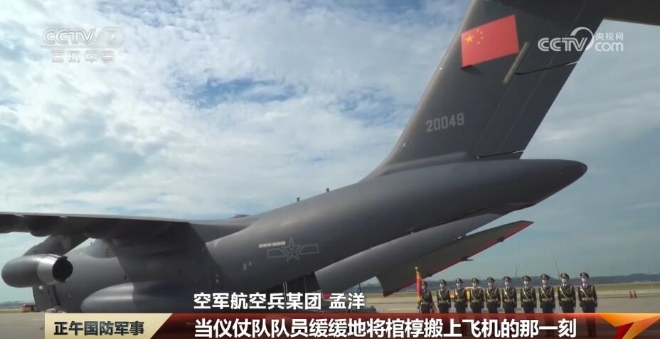 空軍航空兵某團(tuán) 孟洋:當(dāng)時(shí)在儀式的現(xiàn)場(chǎng),我們機(jī)組成員是列隊(duì)在飛機(jī)的后艙位置,準(zhǔn)備迎接烈士遺骸上飛機(jī)。當(dāng)儀仗隊(duì)隊(duì)員緩緩地將棺槨搬上飛機(jī)的那一刻,我看著一面面國(guó)旗覆蓋在棺槨上,直到那一刻,我才更加深刻地理解我們國(guó)旗的顏色是由無(wú)數(shù)革命先烈鮮血染成的。