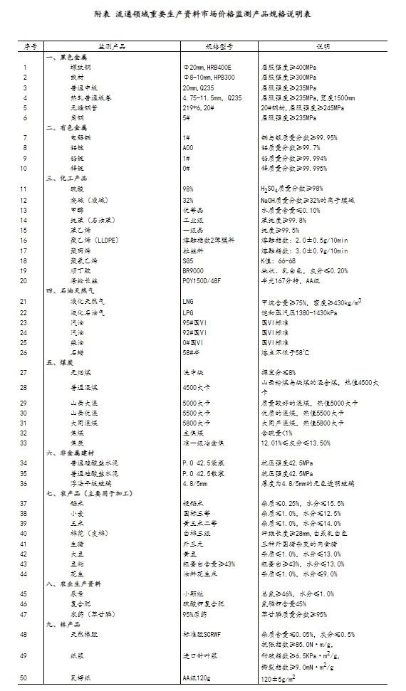 流通領域重要生產(chǎn)資料市場價格監(jiān)測內容包括9大類50種產(chǎn)品的價格。類別與產(chǎn)品規(guī)格說明詳見附表。
