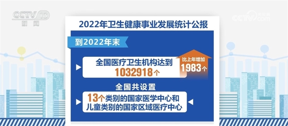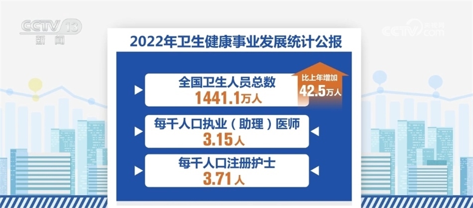 《公報》顯示,我國醫(yī)療衛(wèi)生資源總量繼續(xù)增加。到2022年末,全國醫(yī)療衛(wèi)生機構達到1032918個,比上年增加1983個。全國共設置13個類別的國家醫(yī)學中心和兒童類別的國家區(qū)域醫(yī)療中心。全國醫(yī)療衛(wèi)生機構床位975.0萬張,每千人口醫(yī)療衛(wèi)生機構床位數(shù)由2021年的6.70張增加到2022年的6.92張。全國衛(wèi)生人員總數(shù)1441.1萬人,比上年增加42.5萬人。每千人口執(zhí)業(yè)(助理)醫(yī)師3.15人,每千人口注冊護士3.71人。