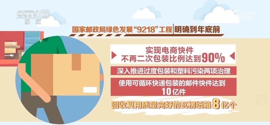 2023年年底前,按照國(guó)家郵政局實(shí)施的綠色發(fā)展“9218”工程要求,電商快件不再二次包裝比例將達(dá)到90%,深入推進(jìn)過(guò)度包裝和塑料污染兩項(xiàng)治理,使用可循環(huán)快遞包裝的郵件快件達(dá)到10億件,回收復(fù)用質(zhì)量完好的瓦楞紙箱8億個(gè)。