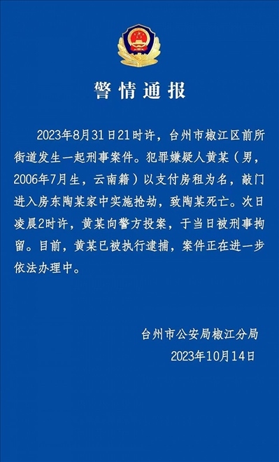 ·浙江臺州警方通報17歲少年殺害65歲房東:已逮捕。