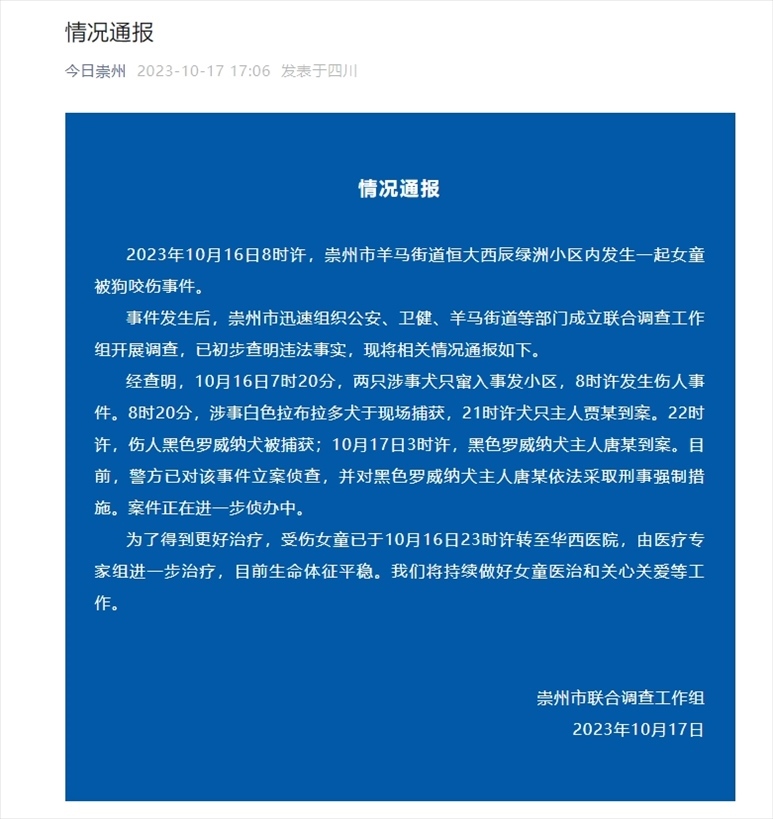 ·四川崇州通報女孩被狗咬傷:羅威納犬主人被采取刑事強制措施。
