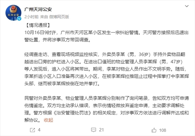 ·廣州警方通報小區(qū)保安將外賣員按地上毆打:雙方均主動承認錯誤,已達成和解協(xié)議。