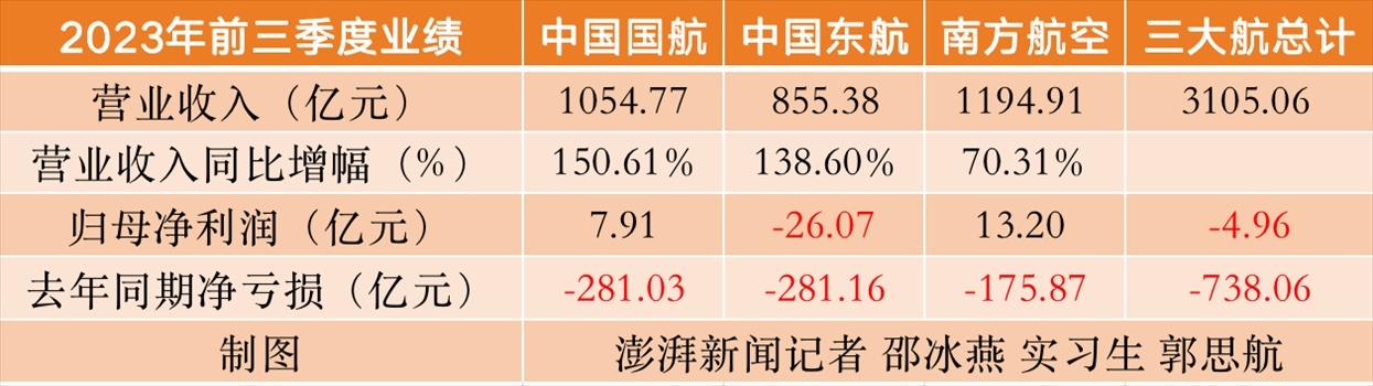截至10月27日晚間,中國國航(601111.SH)、中國東航(600115.SH)、南方航空(600029.SH)陸續(xù)披露完2023年三季報。前三季度,三大航合計實現營收3105.06億元,凈虧損4.96億元。其中三大航三季度單季均實現扭虧,前三季度中僅東航仍虧損。