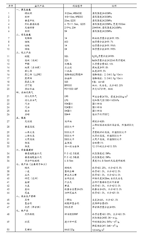 流通領(lǐng)域重要生產(chǎn)資料市場(chǎng)價(jià)格監(jiān)測(cè)內(nèi)容包括9大類(lèi)50種產(chǎn)品的價(jià)格。類(lèi)別與產(chǎn)品規(guī)格說(shuō)明詳見(jiàn)附表。