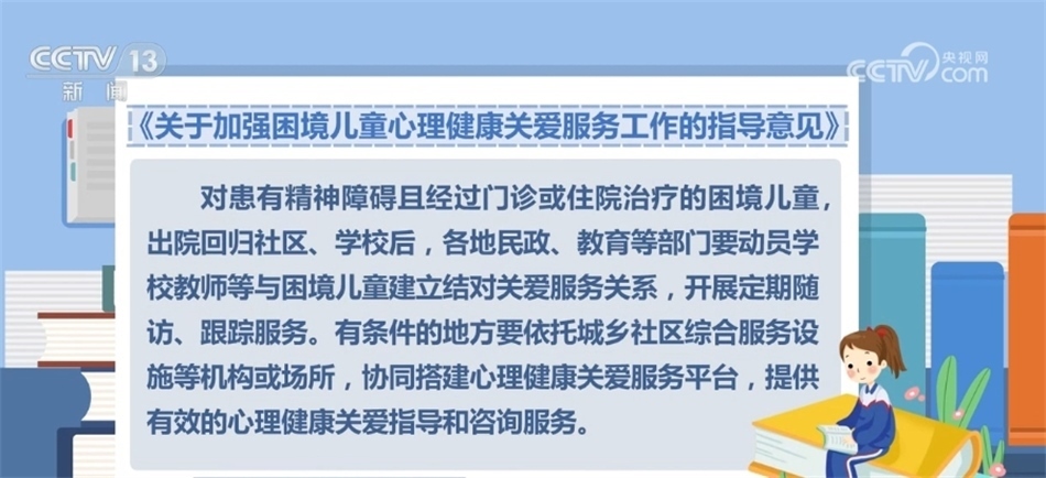 對(duì)患有精神障礙且經(jīng)過(guò)門(mén)診或住院治療的困境兒童,出院回歸社區(qū)、學(xué)校后,各地民政、教育等部門(mén)要?jiǎng)訂T學(xué)校教師等與困境兒童建立結(jié)對(duì)關(guān)愛(ài)服務(wù)關(guān)系,開(kāi)展定期隨訪、跟蹤服務(wù)。有條件的地方要依托城鄉(xiāng)社區(qū)綜合服務(wù)設(shè)施等機(jī)構(gòu)或場(chǎng)所,協(xié)同搭建心理健康關(guān)愛(ài)服務(wù)平臺(tái),提供有效的心理健康關(guān)愛(ài)指導(dǎo)和咨詢(xún)服務(wù)。