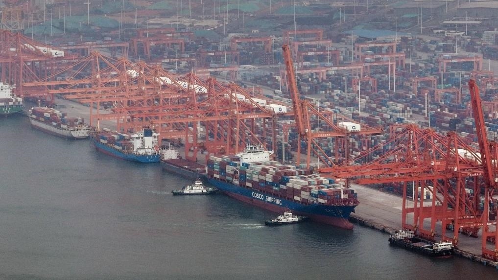 10月26日,在欽州港集裝箱裝卸碼頭,海事船正在協(xié)助海輪離岸(無(wú)人機(jī)照片)。新華社記者 張愛林 攝