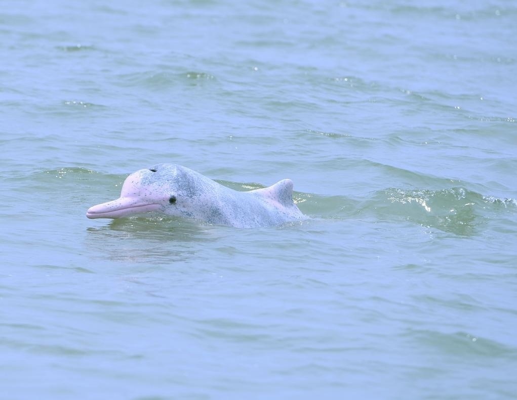 在廣西欽州市三娘灣海域,一頭野生中華白海豚在自由嬉戲。新華社記者 周華 攝
