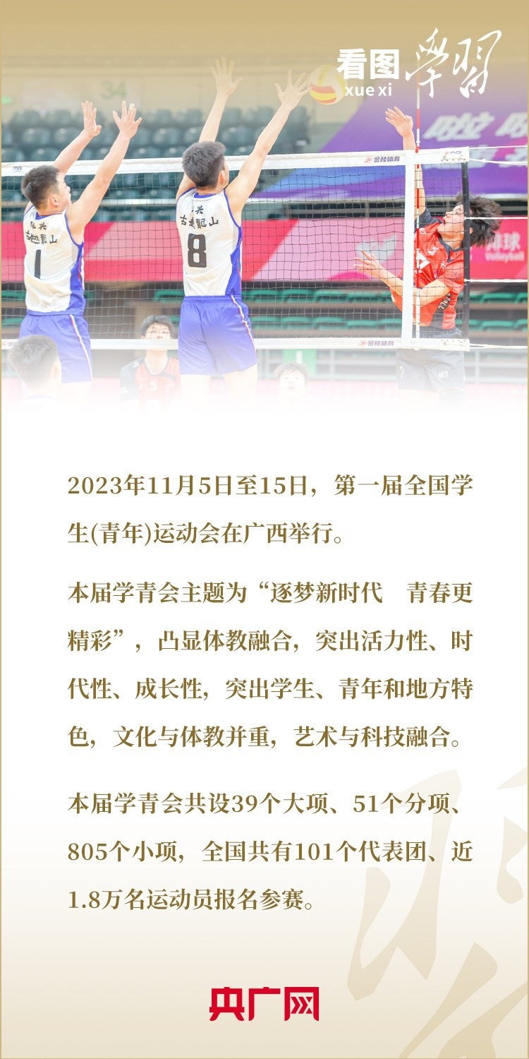 11月5日至15日,第一屆全國學(xué)生(青年)運動會在廣西舉行。這是全國青年運動會和全國學(xué)生運動會合并后的第一屆運動會,是加快體育強國建設(shè)、加快健康中國建設(shè)、深化體教融合發(fā)展、促進青少年健康成長的重要舉措。