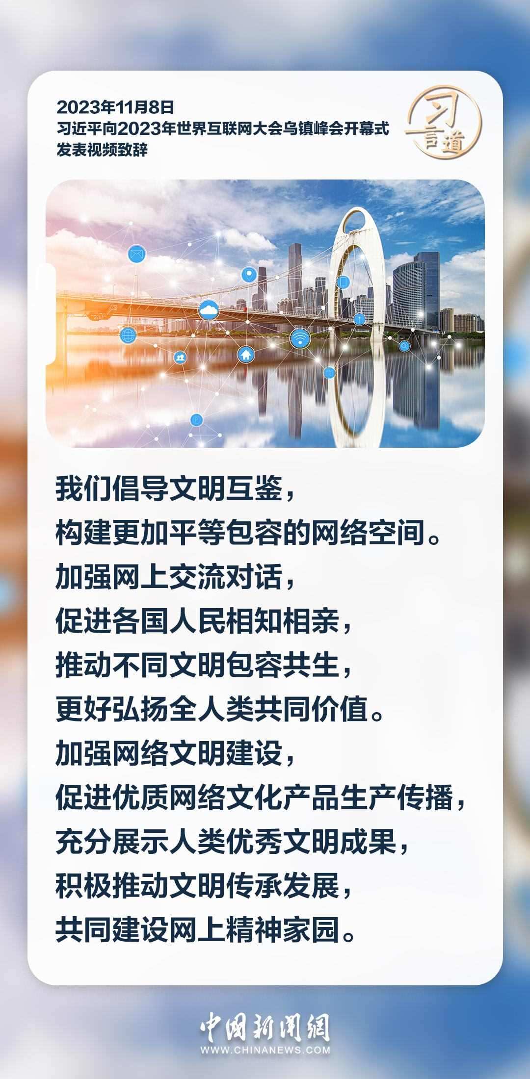 11月8日上午,國家主席習(xí)近平向2023年世界互聯(lián)網(wǎng)大會烏鎮(zhèn)峰會開幕式發(fā)表視頻致辭。習(xí)近平指出——