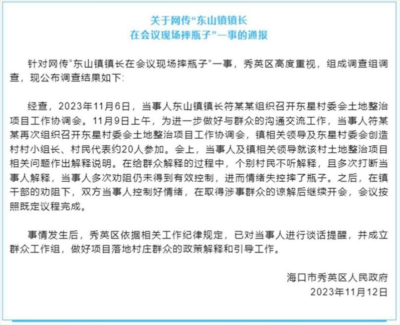 ·??谛阌^(qū)通報(bào)“東山鎮(zhèn)鎮(zhèn)長(zhǎng)在會(huì)議現(xiàn)場(chǎng)摔瓶子”:已對(duì)當(dāng)事人進(jìn)行談話提醒。
