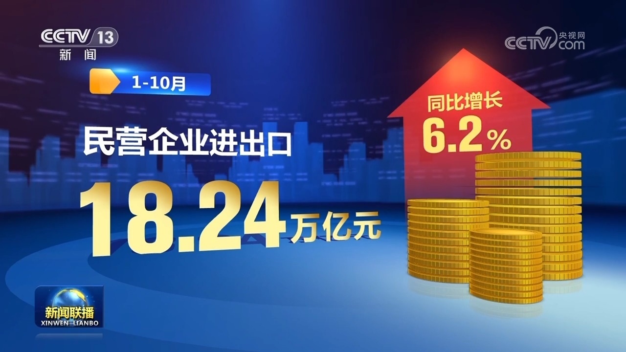新動(dòng)能帶動(dòng)作用持續(xù)釋放,推動(dòng)外貿(mào)領(lǐng)域積極因素累積增多。前三季度跨境電商進(jìn)出口額達(dá)1.7萬億元,同比增長(zhǎng)14.4%,保持較快增長(zhǎng)。貿(mào)易結(jié)構(gòu)優(yōu)化升級(jí),1—10月,我國一般貿(mào)易進(jìn)出口增長(zhǎng)1.8%,占我國外貿(mào)總值的64.9%,比去年同期提升1.1個(gè)百分點(diǎn)。民營企業(yè)進(jìn)出口18.24萬億元,同比增長(zhǎng)6.2%,成為穩(wěn)外貿(mào)主力軍。