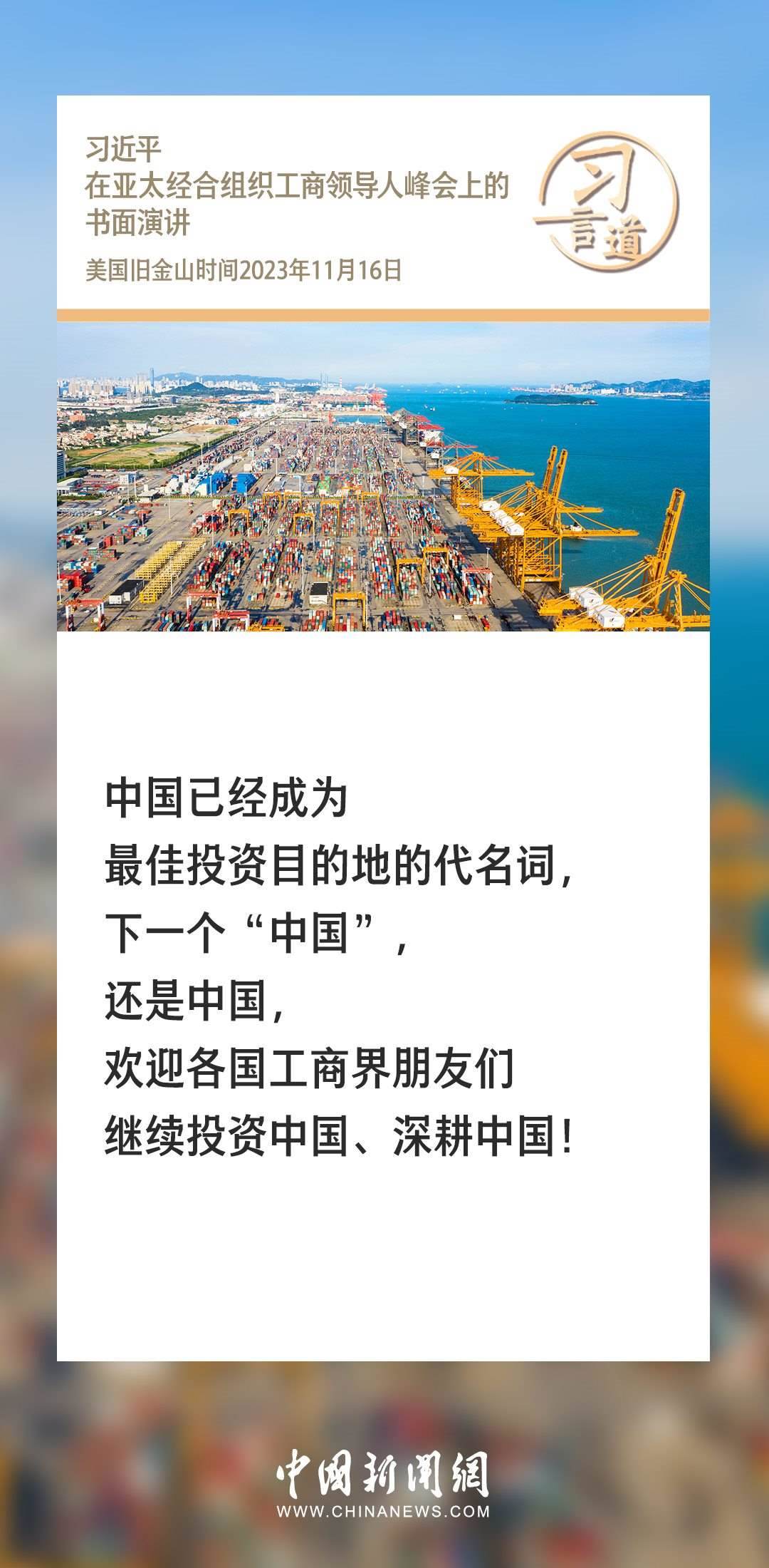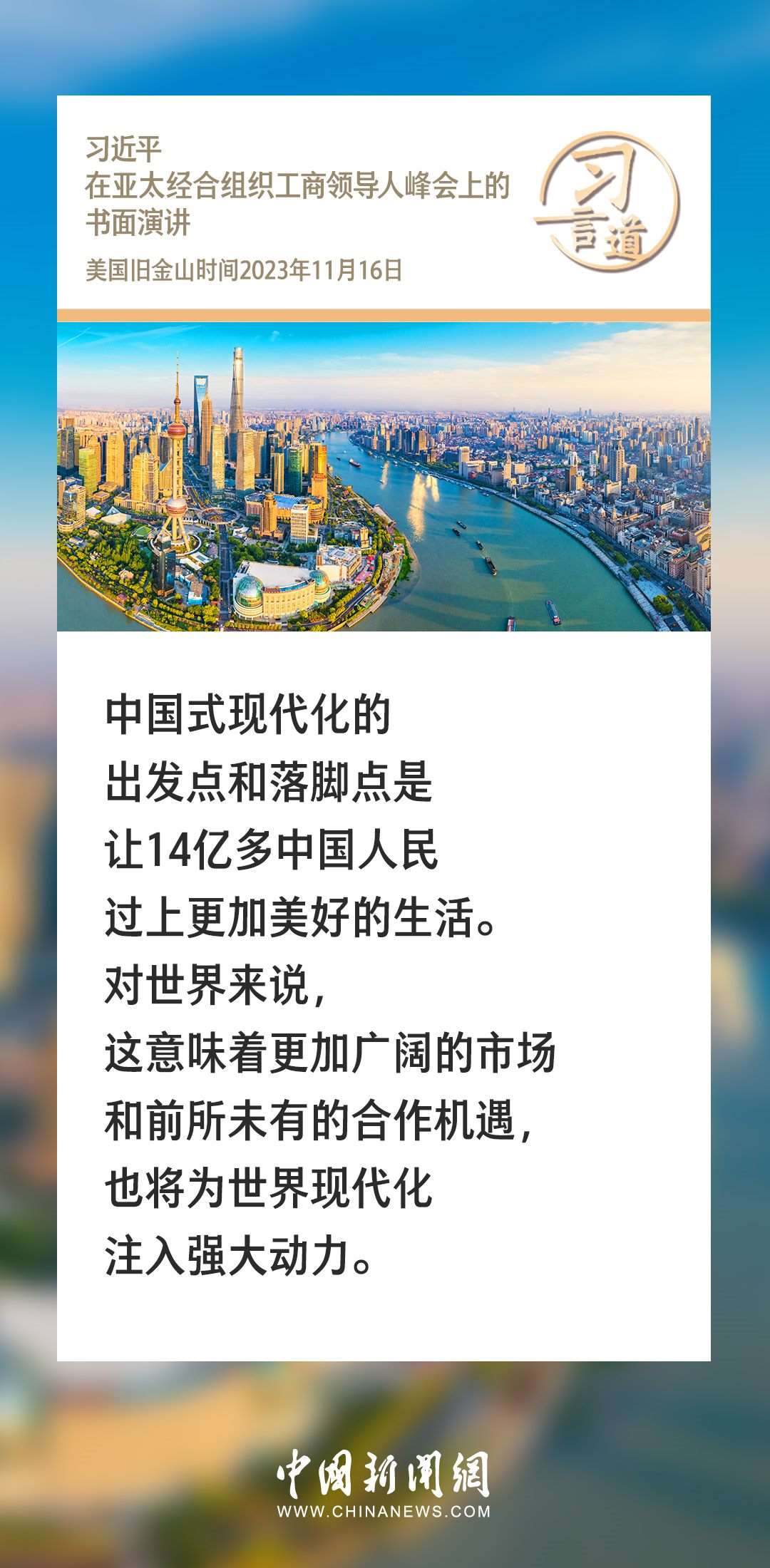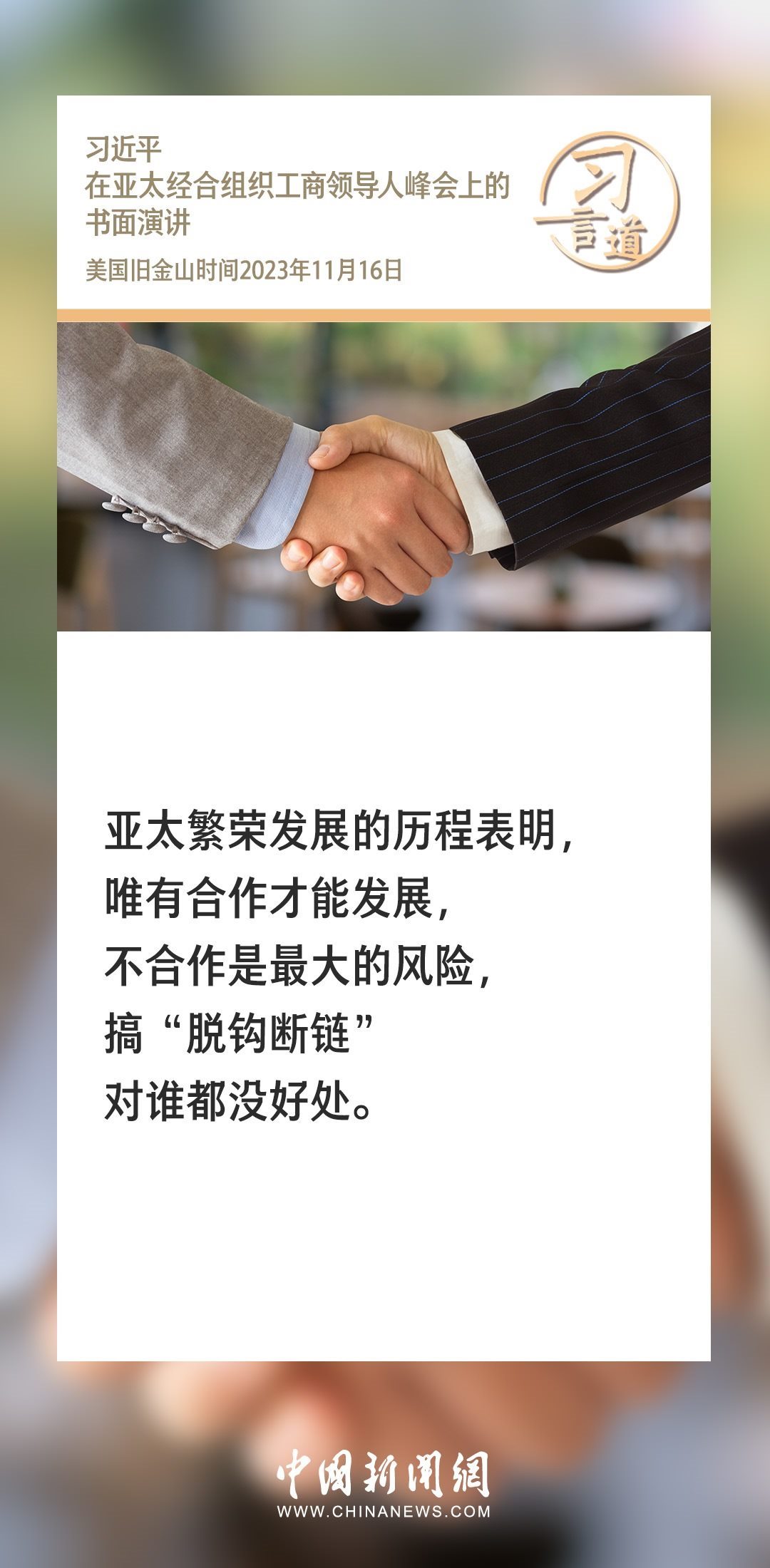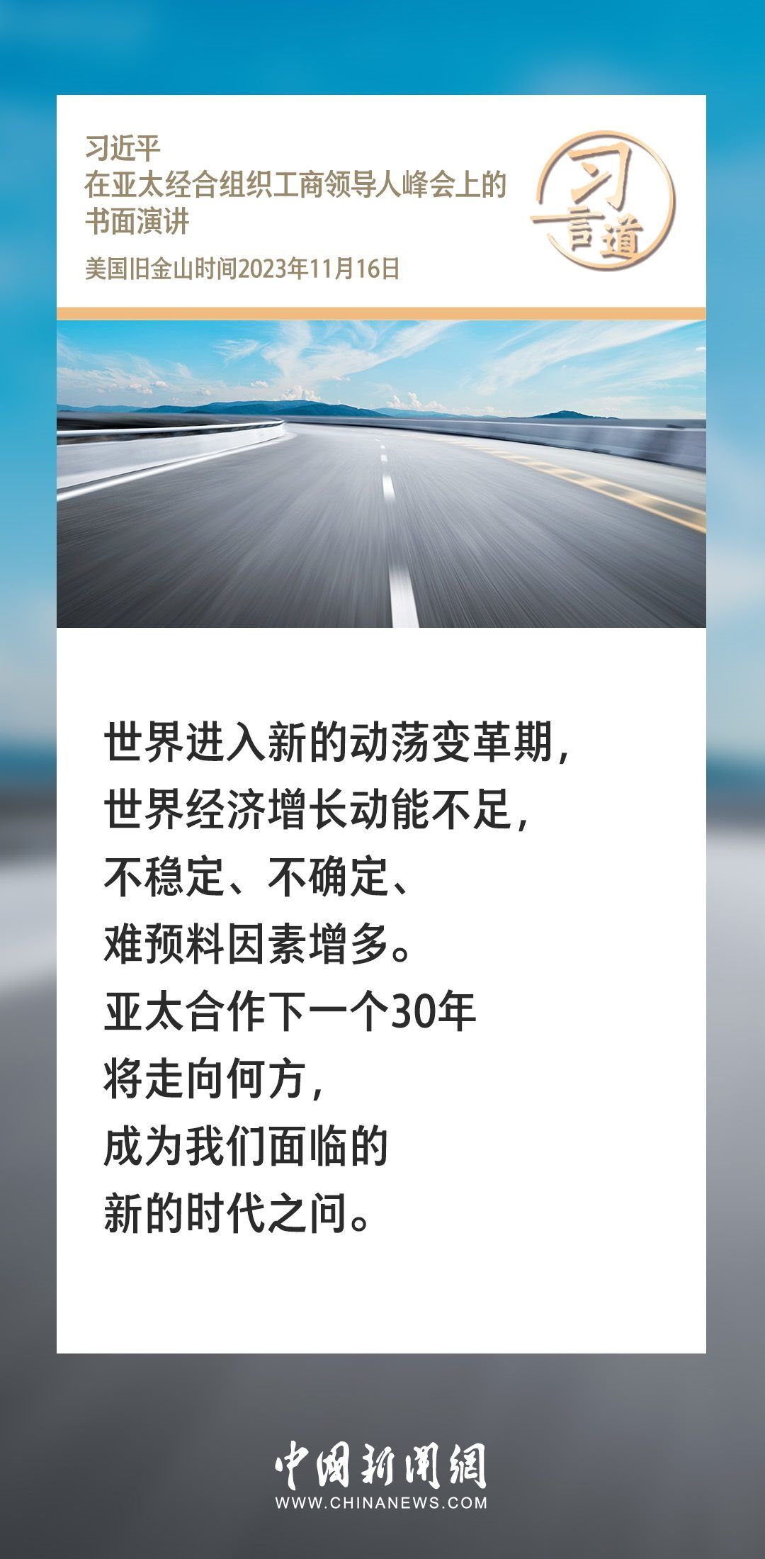 當(dāng)?shù)貢r(shí)間11月16日上午,國(guó)家主席習(xí)近平向在舊金山舉行的亞太經(jīng)合組織工商領(lǐng)導(dǎo)人峰會(huì)發(fā)表題為《同心協(xié)力 共迎挑戰(zhàn) 譜寫(xiě)亞太合作新篇章》的書(shū)面演講。習(xí)近平指出——