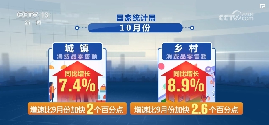 國(guó)家統(tǒng)計(jì)局最新數(shù)據(jù)顯示,在縣鄉(xiāng)消費(fèi)市場(chǎng)基礎(chǔ)設(shè)施不斷完善、有效供給持續(xù)擴(kuò)大等有利條件帶動(dòng)下,鄉(xiāng)村市場(chǎng)銷(xiāo)售增速快于城鎮(zhèn)。10月份,城鎮(zhèn)、鄉(xiāng)村消費(fèi)品零售額同比分別增長(zhǎng)7.4%和8.9%,增速比9月份分別加快2和2.6個(gè)百分點(diǎn)。