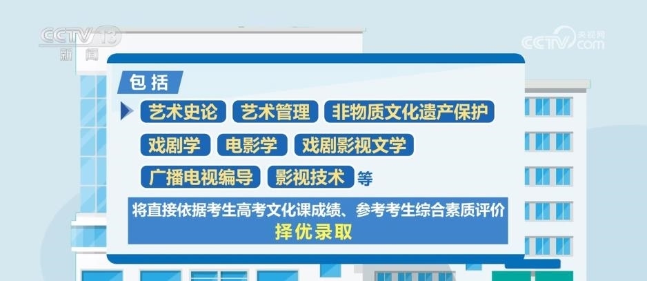 據(jù)了解,藝術類專業(yè)依據(jù)考生高考文化成績、專業(yè)考試成績,參考綜合素質(zhì)評價進行招生錄取。此次藝考改革一個重要的變化是,部分藝術類專業(yè)不再組織專業(yè)考試,包括藝術史論、藝術管理、非物質(zhì)文化遺產(chǎn)保護、戲劇學、電影學、戲劇影視文學、廣播電視編導、影視技術等,將直接依據(jù)考生高考文化課成績、參考考生綜合素質(zhì)評價,擇優(yōu)錄取。
