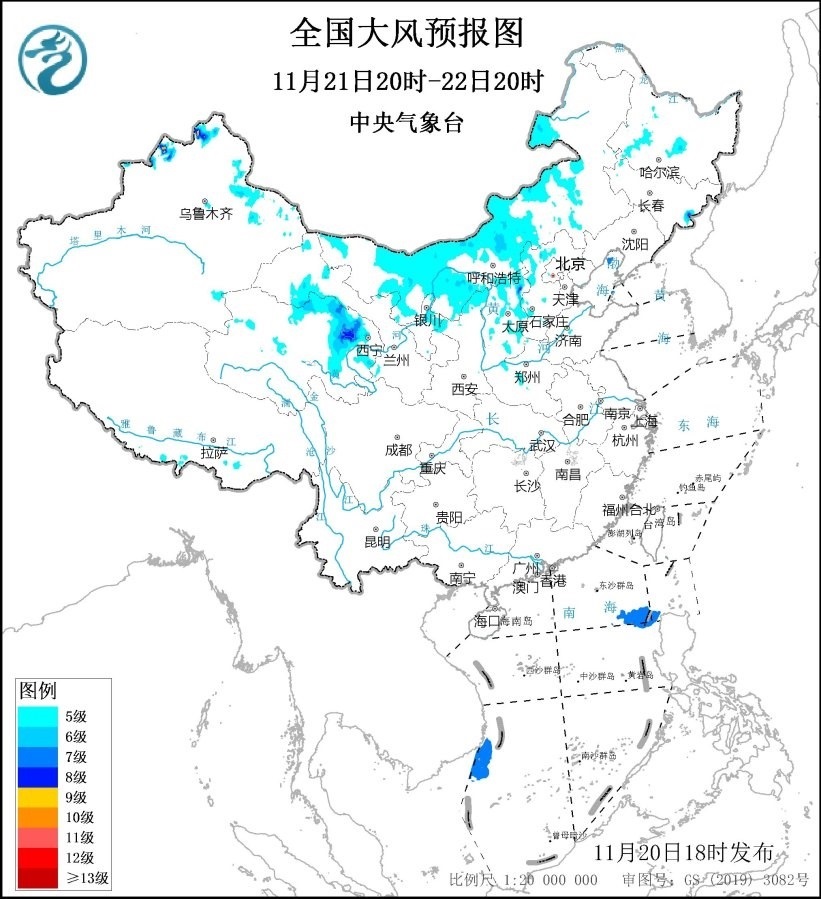11月21日20時至22日20時,新疆北部、內(nèi)蒙古大部、甘肅西北部、青海北部、寧夏北部、陜西北部、山西大部、河北西部、黑龍江西部、吉林東部等地部分地區(qū)將有5~6級、陣風7~8級的大風;巴士海峽、南海中東部和西南部海域?qū)⒂?~8級、陣風9級的大風。
