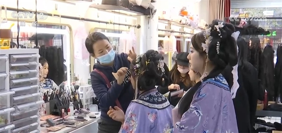 這股國潮風也帶動了南京漢服的租賃、妝造等周邊產業(yè),離老門東很近的剪子巷,500米左右的巷子就有20家左右的漢服租賃店。