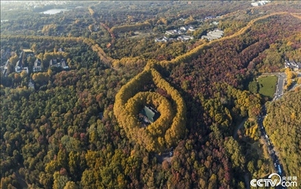 2023年11月19日,南京,初冬時(shí)節(jié)的鐘山風(fēng)景名勝區(qū)層林盡染,色彩斑斕??罩懈╊晃嗤?shù)包圍的美齡宮,宛如一條“金色項(xiàng)鏈”,美不勝收。