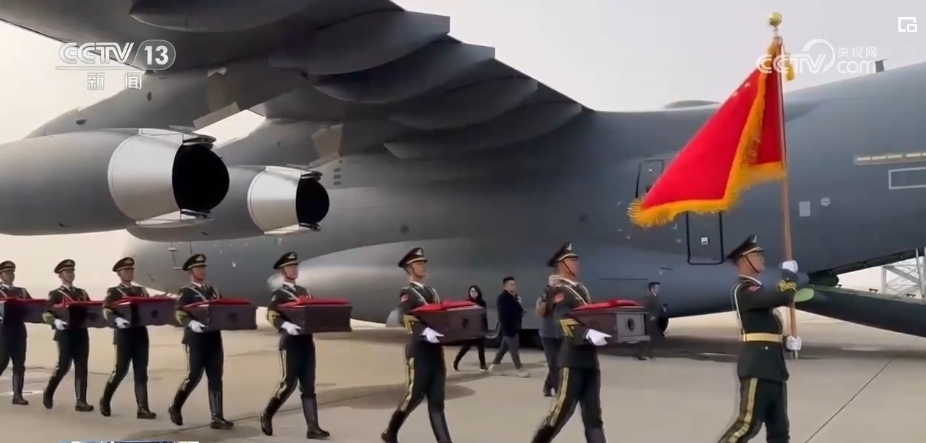 隨后,中方禮兵護(hù)送棺槨走上中國(guó)空軍運(yùn)-20運(yùn)輸機(jī)。北京時(shí)間11月23日上午,運(yùn)-20運(yùn)輸機(jī)從仁川國(guó)際機(jī)場(chǎng)起飛。