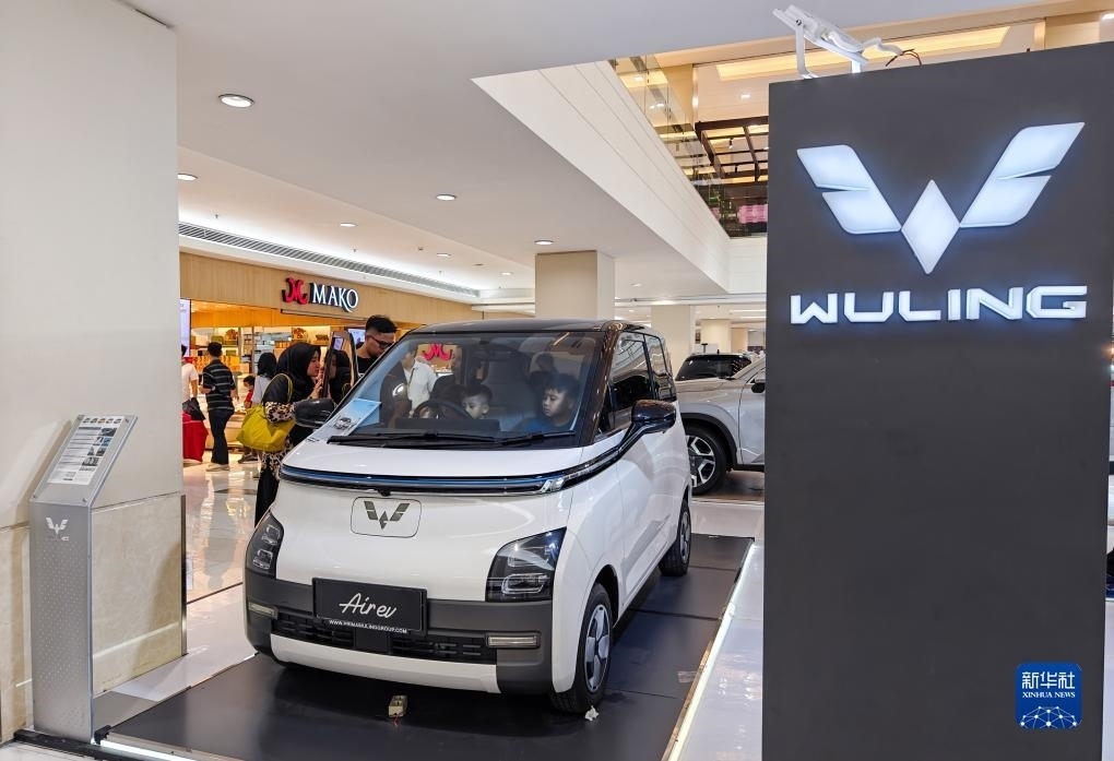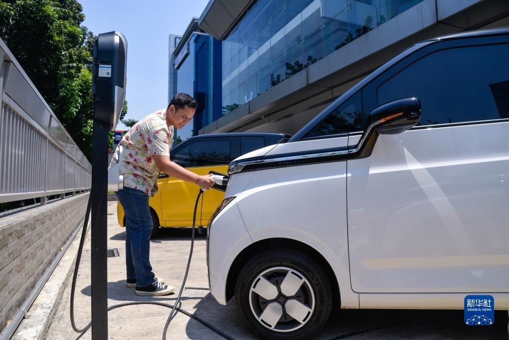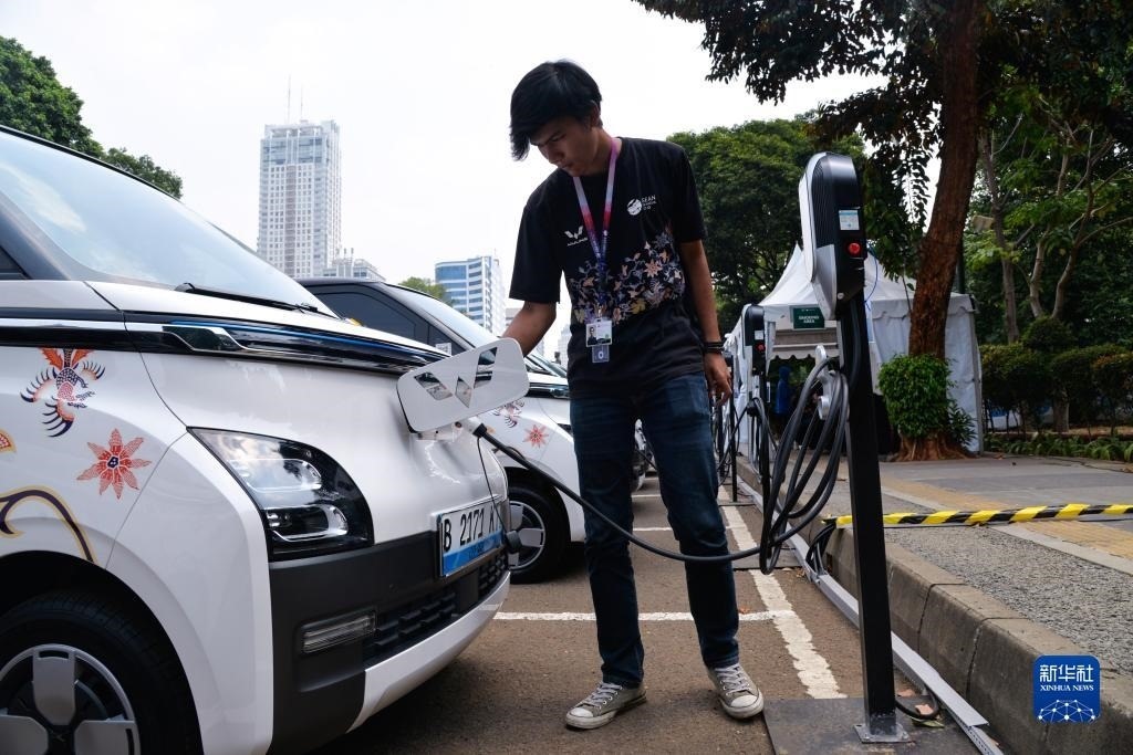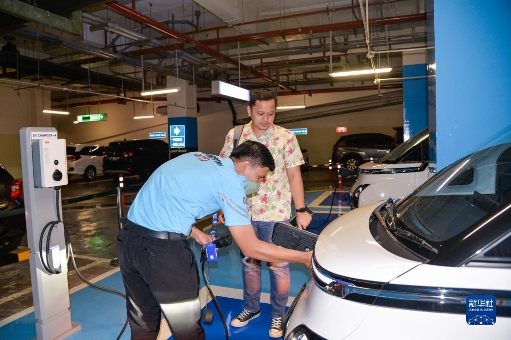 9月29日,在印度尼西亞雅加達一家商場的地下停車場,工作人員為一位五菱新能源車Air ev車主結束充電。新華社記者 徐欽 攝