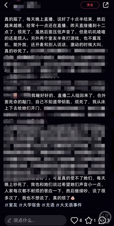 在某社交平臺搜索“室友在宿舍直播”,上游新聞記者發(fā)現(xiàn)超過50篇筆記都是有關(guān)大學(xué)生寢室直播引發(fā)室友不滿:“每天晚上吵死了,我也和她們說過希望她們聲音小一點,人家每次都不耐煩地答應(yīng)一下,然后繼續(xù)吵”“我覺得在寢室直播就是不合適啊,但是想不到什么嚴肅有效的理由讓她不直播,求大家?guī)兔Τ鲋\劃策一下”……