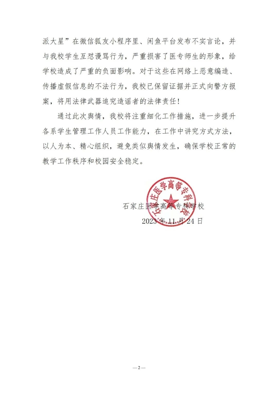 央視網(wǎng)消息:近日,網(wǎng)傳石家莊醫(yī)學(xué)高等專科學(xué)校檢查學(xué)生宿舍,并將沒收來的物品掛在二手平臺(tái)咸魚上出售,事件引發(fā)關(guān)注。11月24日,石家莊醫(yī)學(xué)高等??茖W(xué)校發(fā)布聲明稱,22日學(xué)校利用學(xué)生在宿舍時(shí)間,排查大功率違規(guī)電器。查獲違規(guī)電器分別由各系登記造表、統(tǒng)一保管,定于放寒假時(shí)返還學(xué)生帶回家。經(jīng)核實(shí),網(wǎng)傳短視頻實(shí)為學(xué)生準(zhǔn)備去實(shí)習(xí)一起收拾房間物品時(shí)的視頻,被別有用心人員移花接木、惡意引用。此外,網(wǎng)名為“林北我叫派大星”在微信狐友小程序里、閑魚平臺(tái)發(fā)布不實(shí)言論,并與學(xué)校學(xué)生互懟謾罵行為,嚴(yán)重?fù)p害了醫(yī)專師生的形象,給學(xué)校造成了嚴(yán)重的負(fù)面影響。學(xué)校已保留證據(jù)并正式向警方報(bào)案。