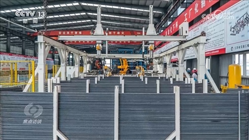 中交二航局常泰長江大橋項目部常務(wù)副經(jīng)理王輝:“傳統(tǒng)的橋塔鋼筋怎么做呢?通過吊機(jī)把鋼筋吊到塔上,作業(yè)工人一根根把鋼筋綁起來,個人能力有差別,質(zhì)量和精度,鋼筋間距也很難控制,現(xiàn)在我們采用什么理念呢?就是部品的理念,把塔的鋼筋在下面做成一塊一塊的,就像搭積木一樣,大型吊機(jī)把它吊上去,然后一節(jié)節(jié)堆起來?!?/p>