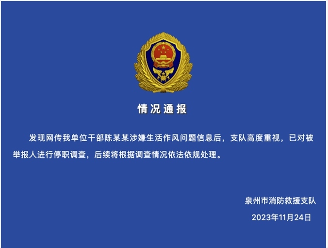 ·官方通報消防科長被舉報婚內出軌:已停職調查。