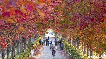 2023年11月24日,蘇州工業(yè)園區(qū)陽澄湖半島莆田有機農業(yè)園紅楓大道上的紅葉燦爛如霞,已到最佳觀賞期,吸引游客前來賞楓。