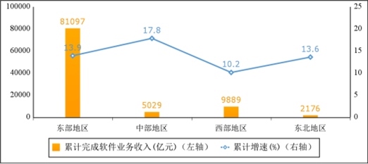西部地區(qū)軟件業(yè)務收入小幅提升,中部地區(qū)增勢突出。1—10月份,東部地區(qū)完成軟件業(yè)務收入81097億元,同比增長13.9%,增速較前三季度回落0.2個百分點;中部地區(qū)完成軟件業(yè)務收入5029億元,同比增長17.8%,增速較前三季度提高5.7個百分點;西部地區(qū)完成軟件業(yè)務收入9889億元,同比增長10.2%,增速較前三季度提高0.3個百分點;東北地區(qū)完成軟件業(yè)務收入2176億元,同比增長13.6%,增速與前三季度持平。四個地區(qū)軟件業(yè)務收入在全國總收入中的占比分別為82.6%、5.1%、10.1%和2.2%。