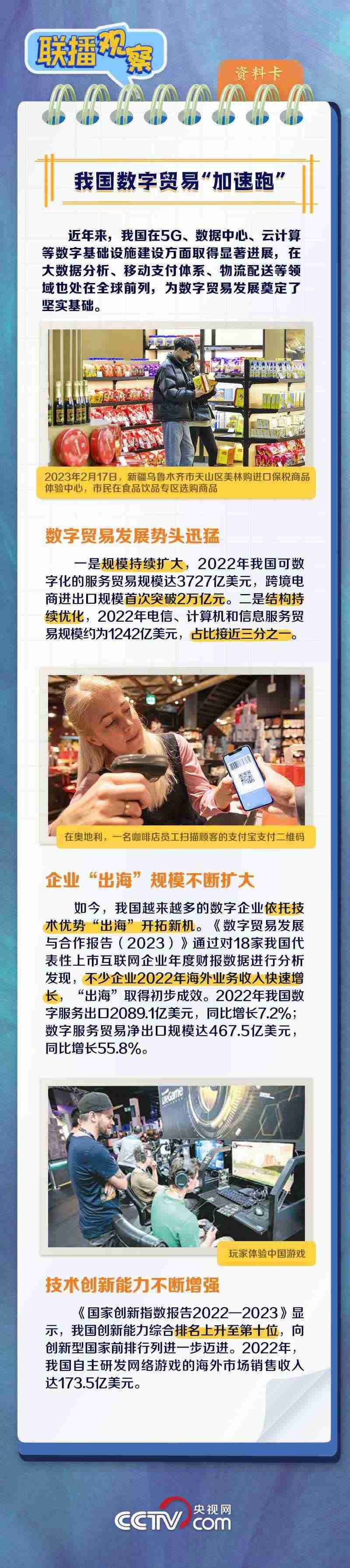 當(dāng)前,貨物貿(mào)易和服務(wù)貿(mào)易都呈現(xiàn)出不可逆的數(shù)字化轉(zhuǎn)型趨勢(shì)。什么是數(shù)字貿(mào)易?本屆數(shù)貿(mào)會(huì)有什么看點(diǎn)和亮點(diǎn)?我國(guó)數(shù)字貿(mào)易有何發(fā)展成果?央視網(wǎng)《聯(lián)播觀察》與您一同了解。