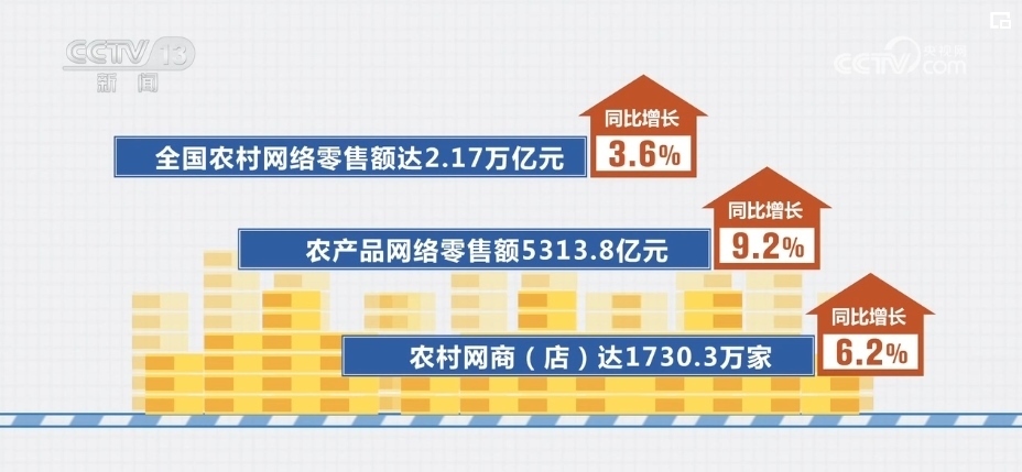 全國農(nóng)村網(wǎng)絡(luò)零售額達2.17萬億元,同比增長3.6%;農(nóng)產(chǎn)品網(wǎng)絡(luò)零售額5313.8億元,同比增長9.2%;農(nóng)村網(wǎng)商(店)達1730.3萬家,同比增長6.2%。