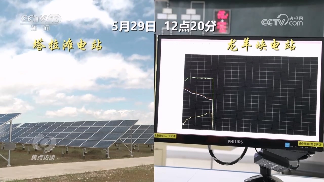 這一天,記者在龍羊峽水電站見到了水電光伏互補(bǔ)的實(shí)時情況。12點(diǎn)20分開始,50公里外塔拉灘光伏現(xiàn)場拍攝的影像顯示,有一大片云經(jīng)過光伏電站,光伏發(fā)電輸出立即發(fā)生了變化。這個數(shù)據(jù)變化實(shí)時傳到水電站的水光互補(bǔ)系統(tǒng)。